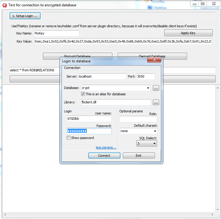Приложение для доступа к БД должно получить точно такой же ключ. Мы подготовили для вас пример приложения на Delphi XE8, с тем же файлом keyholder.conf, что в нашем примере. Поместите файлы приложения в отдельную папку на этом же компьютере, где есть работающий Firebird 3 (с плагином dbcrypt.dll и без keyholder.conf).